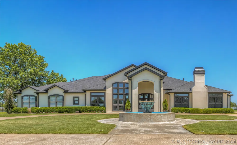 Welcome to your dream home, a sprawling 6,500 sq ft ranch nestled on 5.86 acres of serene countryside in Oklahoma. This property offers a blend of elegance, comfort, and practicality, making it ideal for multi-generational living and hosting unforgettable holidays and events. The spacious home boasts five beautifully sun-drenched bedrooms, four full bathrooms, and two convenient half bathrooms. You'll enjoy three distinct living areas, each with its own charm and character, and the open concept design between the main living room and kitchen is perfect for entertaining. Cozy up to one of three fireplaces, adding warmth and ambiance to your evenings. The main kitchen has beautiful brand new LG kitchen appliances to include microwave, 5 burner cooktop, and double oven with convection and air frying capabilities. Cozy breakfast nook just off the main open kitchen. The fully equipped second kitchen in the in-law suite ensures privacy and convenience for extended family or guests. Stay active and entertained with your own workout room, game room, home theater, and a large covered patio overlooking the swimming pool and grilling area. The pond with a bridge to ‘your private island’ makes this one of a kind. The outdoor space is a paradise with a standard-size tennis court, half-court basketball, and a refreshing swimming pool. The expansive 50 X 100 heated shop includes two offices and a full bathroom, offering versatile use from business to leisure, and spacious enough to accommodate an indoor pickleball court. Additional features of this home include a grand entrance, formal dining room, water filtration system, and generator. The multi-generational living area spans the one level and is thoughtfully designed for both luxury and functionality. Experience the perfect blend of indoor and outdoor living in this remarkable home. Whether you're hosting large gatherings or enjoying peaceful family time, this property offers everything you need and more. Welcome home!
