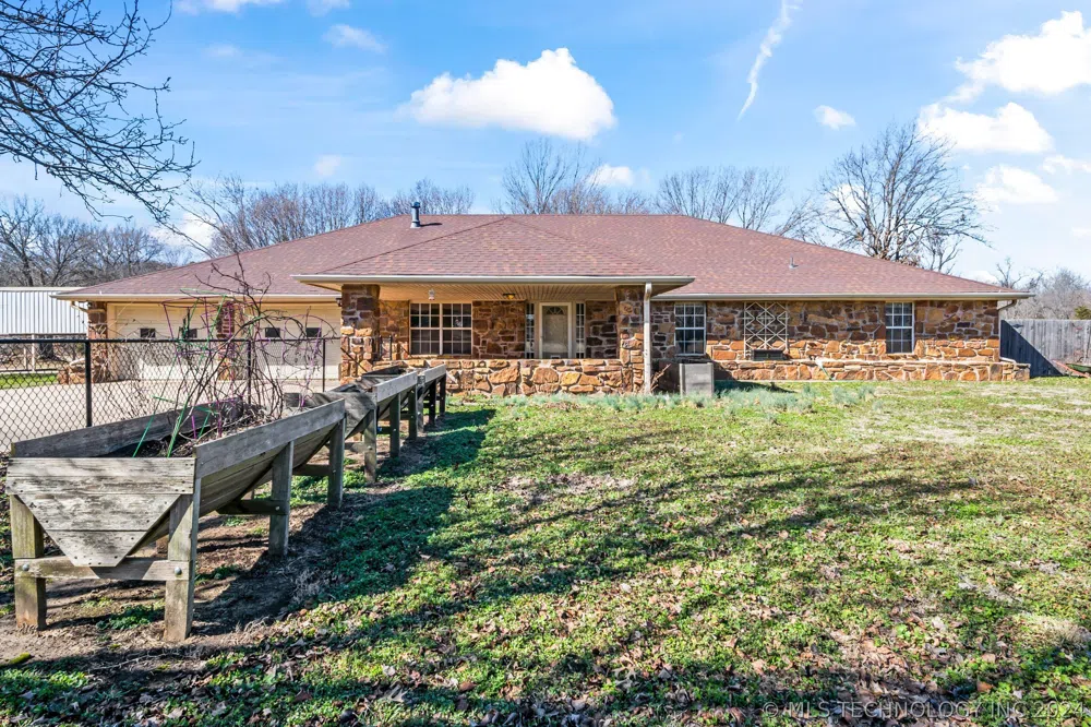 Welcome to your dream ranch-style oasis in Creek County! This home boasts hard surface flooring throughout. Complete with full gutters, shared driveway with a neighbor, and in Kellyville School District with Sapulpa address, this property offers convenience and charm. Situated on 5 acres more or less adorned with mature trees including apple, apricot, peach trees, and luscious blackberry bushes, this residence is a nature lover's paradise. Inside, discover a divided Florida room with an in-ground storm shelter. Ideal for multi-generational living, primary and two additional bedrooms feature en-suites. The primary suite is a luxury retreat with a private bath showcasing separate vanities, a large walk-in-shower, and double walk-in closets. Step into the inviting Florida room, offering views of the expansive property, including a shared pond with a private dock perfect for fishing or launching a boat. The heart of the home is the kitchen boasting a convenient breakfast bar for casual dining. The raised panel dining room features built in cabinetry, adding a touch of elegance to every meal. Stay warm and cozy during winter days and nights with a wood-burning stove in the spacious living room. Additional features include a HWT installed in 2023, RV Carport, extra parking space and side garage converted to living space. Enjoy the convenience of a 2 car garage and the peace of mind provided by a whole-home surge protector. This all-electric home also includes a propane-powered hot water tank with leased propane tank. Don't miss your chance to own this exception property that combines rural serenity with modern amenities. Seller offering up to $5000 in Buyers closing costs with acceptable offer. Schedule your showing today and start living the ranch-style lifestyle you've always dreamed of!
