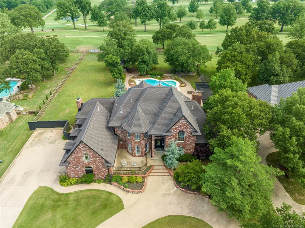 Location! Location! Location! Incredible golf course view ~ nestled on the 17th fairway! You’ll love this beautiful Home with a stunning backyard oasis that is 100% entertainment and amenable to parties of all seasons. This home is approx 4937 sq ft & situated on over an acre in the desirable Oak Country Estates in Tulsa. Enjoy hosting both family and friends in the resort style backyard with an inground swimming pool, heated lap pool, large hot tub, gazebo, pool house, cabana, massive covered patio with firepit, outdoor kitchen, new custom exterior paint and so much more! The spacious main level features open dramatic 18 ft ceilings with an abundance of windows allowing natural light throughout the home. The floorplan allows for an open flow in the main living areas. The main level has a grand entry & spacious living room with brick fireplace, a sitting room or open office area, a spacious kitchen & well lit eat-in area with built-in bookcases, entertaining bar, an additional fireplace, & gorgeous views of the backyard. The Master suite has a fireplace & large master ensuite with a spacious walk in closet. The impressive wood paneled library has a fireplace, built in bookcases & French doors leading to the backyard. The upper level is complete with three bedrooms, two bathrooms and a big floored attic space. There is an additional private staircase leading to a flex room with bathroom which is ideal for an optional fifth bedroom, exercise, or game room. Not only does the handsome full brick exterior and elevation inspire you, but the expansive 3 car garage, extra long driveway, and circular driveway offer ample parking space to accommodate guests. Great neighborhood and excellent location near Oaks Country Club, Golf Course, Camp Loughridge, Turkey Mountain, and Tulsa Hills with easy access to highway 75. The possibilities are endless making this a must-see home!